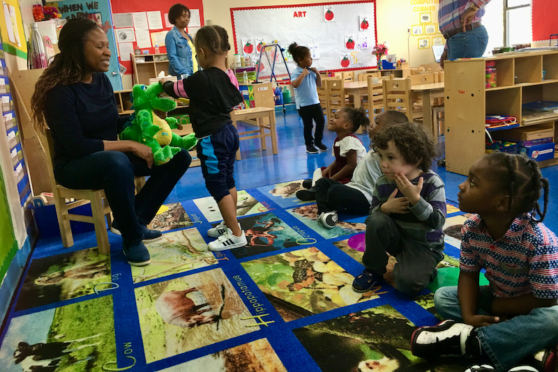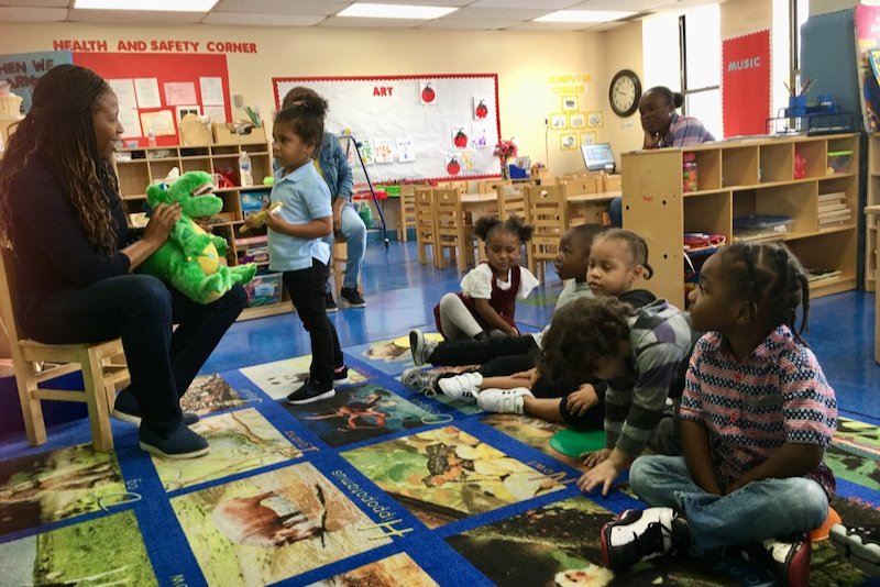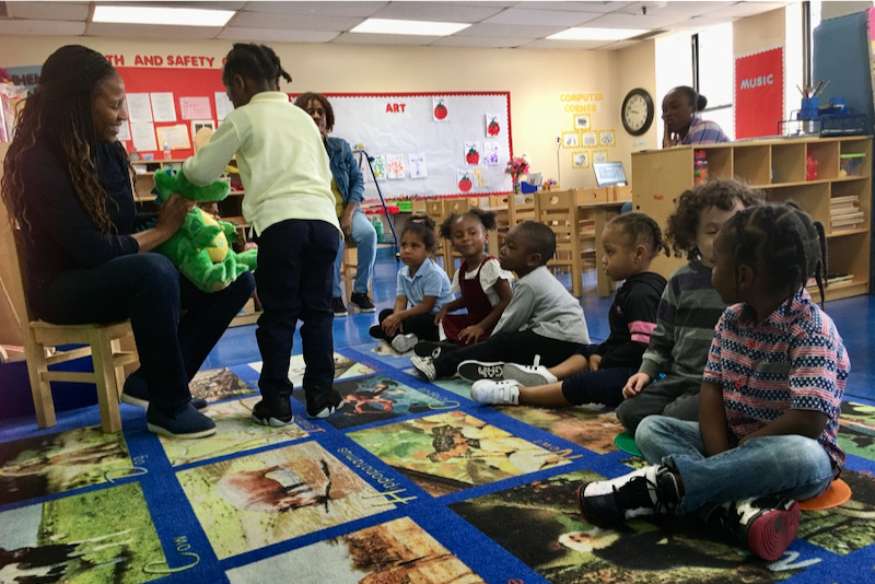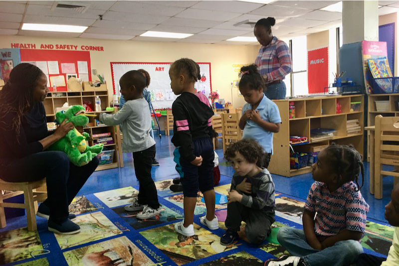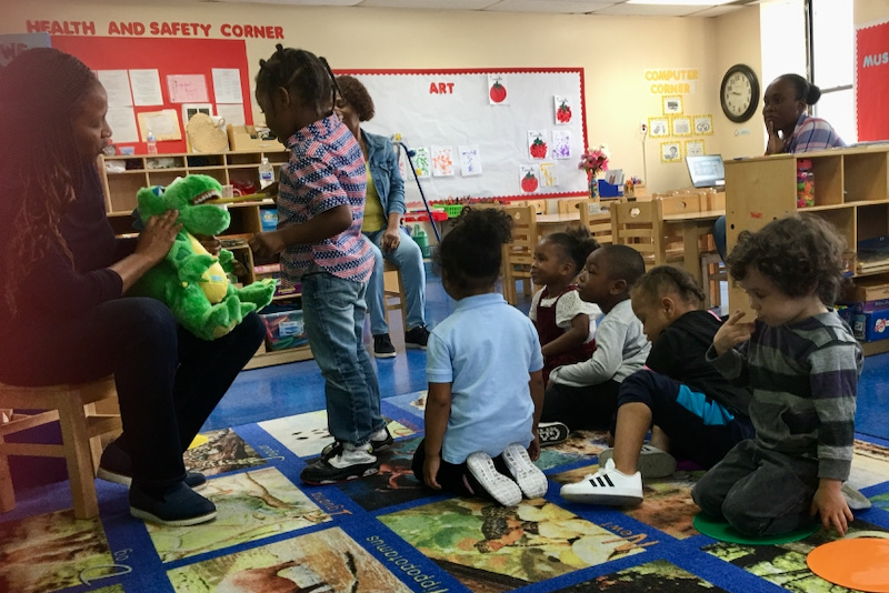 One of the best parts of the lesson was the segment on tooth brushing. Many young children are not aware of proper oral hygiene and often skip brushing their teeth. This presents a huge problem for them, especially if they enjoy sugary sweets. Germs, bacteria, and sugar deteriorate their little teeth and cavities begin. Prevention is better than the cure, so we advocate healthy snacks and, of course, tooth brushing. We used our harmless, toothy, green dinosaur as a mascot for the children to interact and practice with.