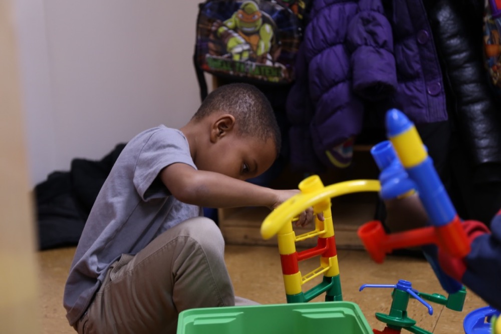 This child spends some creative time exploring the colorful building toys. Children can sit for hours making different patterns and shapes, often pretending they are buildings, robots, family members, or anything else that crosses their mind.