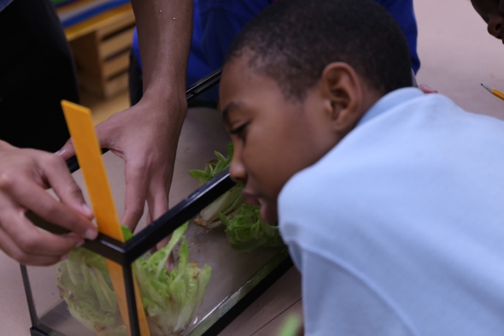We incorporate nature concepts into our academics. For this project—regrowing stumps of lettuce—the afterschool children were responsible for monitoring the growth of their produce.